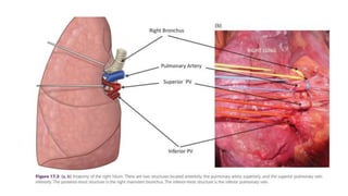 1. El documento describe la anatomía de la tráquea, bronquios y parénquima pulmonar, así como lesiones comunes como resultado del trauma torácico, incluyendo contusiones pulmonares, laceraciones traqueobronquiales y lesiones al parénquima pulmonar.