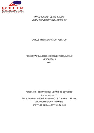 Este documento presenta los resultados de una investigación de mercados realizada sobre la línea de vehículos Spark GT de Chevrolet en Colombia. Incluye un análisis de la demanda, el perfil del comprador, las ventas históricas, la competencia y estudios cualitativos y cuantitativos. Los hallazgos principales son que el comprador típico es una persona empleada o independiente con poder adquisitivo moderado-alto que busca un vehículo funcional y económico para uso diario, y que las ventas de Chevrolet han dismin