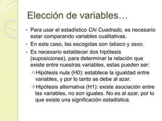 Se analiza la relación entre el consumo de tabaco y el sexo utilizando el estadístico chi cuadrado, formulando hipótesis nula (h0) y alternativa (h1). A través de frecuencias observadas y esperadas, se determina que el valor calculado de chi cuadrado es 0,008, que es menor que el valor crítico de 3,8415, lo que lleva a aceptar la h0. Esto indica que no existe una relación estadísticamente significativa entre el sexo y el consumo de tabaco en la muestra estudiada.
