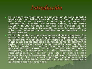 El documento describe el origen y uso histórico de la chía por las civilizaciones precolombinas en América Central. La chía era un alimento básico para los aztecas y mayas y se utilizaba también en ceremonias religiosas. Tras la conquista española, los conquistadores trataron de eliminar la chía debido a su uso en rituales paganos.