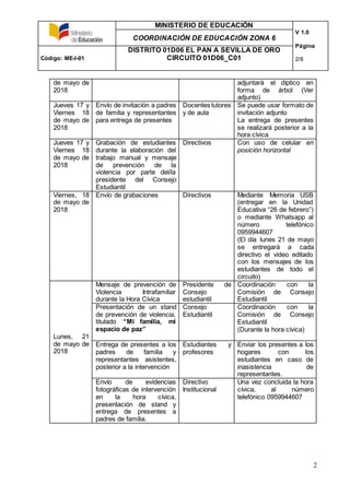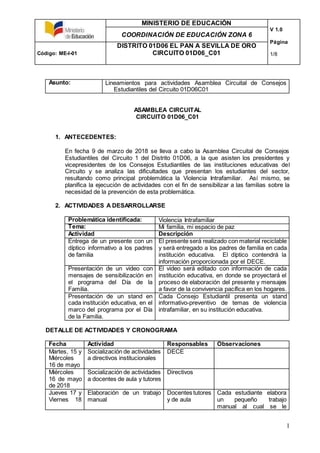 El documento describe las actividades planeadas por los Consejos Estudiantiles de varias escuelas para prevenir la violencia intrafamiliar. Los estudiantes elaborarán presentes con mensajes de paz familiar y grabarán videos con el mismo mensaje. Estas actividades se llevarán a cabo durante el Día de la Familia, donde los estudiantes entregarán los presentes a los padres y presentarán stands informativos. El objetivo es sensibilizar a las familias sobre la importancia de un hogar sin violencia.