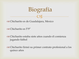 Este documento presenta una biografía del futbolista mexicano Javier Hernández, también conocido como "Chicharito". Resume que Chicharito nació en Guadalajara, México, firmó su primer contrato profesional a los 15 años y ha tenido una exitosa carrera con el Manchester United y la selección mexicana, anotando numerosos goles.