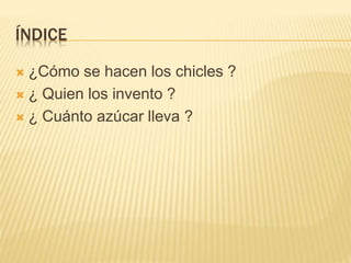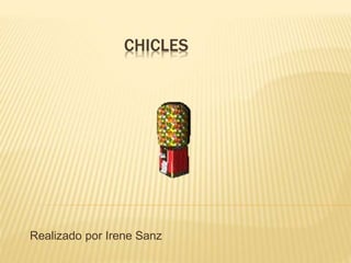 El documento resume cómo se hacen los chicles, quién los inventó y los posibles efectos secundarios de su consumo. Los chicles están hechos de una resina natural extraída del árbol zapote, mezclada con parafina y saborizantes. Fueron inventados por William F. Semple. Algunos posibles efectos secundarios incluyen un mayor consumo de alimentos chatarra, problemas de mandíbula o abdominales, y daños en los dientes, incluso con chicles sin azúcar.