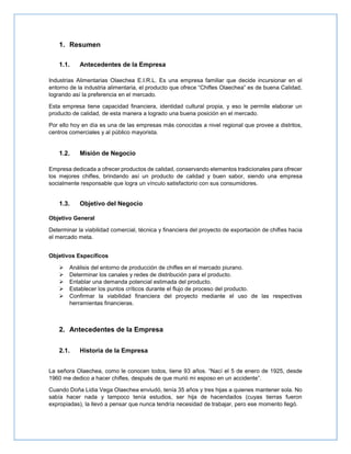 La empresa Industrias Alimentarias Olaechea E.I.R.L produce chifles de alta calidad en Perú y busca expandirse a nuevos mercados. Fundada en 1960 por Lidia Olaechea para sustentar a su familia, la empresa ahora es reconocida regionalmente por sus chifles. El documento describe la historia de la empresa, su misión y objetivos, y analiza el entorno interno y externo incluyendo competidores como Plantain Products Co., Mariquitas y Samai.