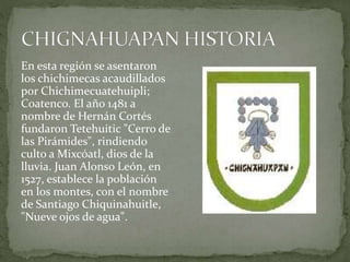 El documento describe la historia, geografía, economía y cultura de Chignahuapan, Puebla. Originalmente habitado por los chichimecas, la región se asentó en el siglo XVI y se dedicó a la agricultura, ganadería, silvicultura, minería e industria. Es conocido por la producción de esferas navideñas de vidrio y sus aguas termales. Celebra varias fiestas religiosas y tradicionales y ofrece gastronomía como el mole poblano y dulces regionales.