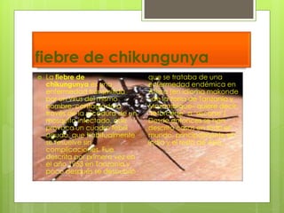 El documento describe la fiebre de Chikungunya, una enfermedad viral transmitida por la picadura de mosquitos infectados. El virus Chikungunya pertenece al grupo de los parvovirus y causa síntomas como fiebre alta y dolores articulares. No existe un tratamiento específico, solo se pueden tratar los síntomas con analgésicos como el paracetamol.
