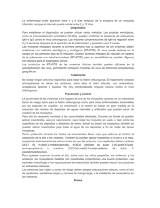 La fiebre chikungunya es una enfermedad vírica transmitida por la picadura de mosquitos infectados de los géneros Aedes aegypti y Aedes albopictus. Provoca fiebre y fuertes dolores articulares, además de otros síntomas como dolores musculares y de cabeza. No tiene tratamiento curativo específico, por lo que el tratamiento se centra en aliviar los síntomas. Se han detectado brotes en África, Asia, Europa y las Américas.