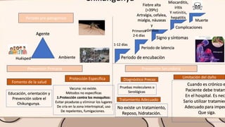El documento aborda el chikungunya, enfatizando la importancia de la prevención primaria mediante educación y medidas para evitar picaduras de mosquitos, ya que no existe una vacuna. La prevención secundaria incluye diagnóstico precoz y tratamiento sintomático, ya que no hay un tratamiento específico disponible. Se describen los signos, síntomas y complicaciones de la enfermedad, así como el periodo de incubación de 1 a 12 días.