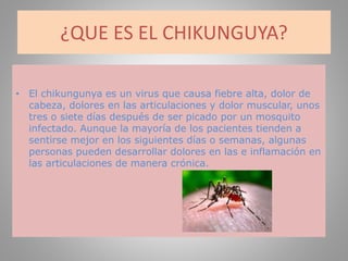 El documento describe los síntomas, causas y métodos de transmisión del virus del chikunguña. El chikunguña causa fiebre alta, dolor de cabeza y dolores musculares y articulares que se transmiten a través de la picadura de mosquitos infectados. Los síntomas incluyen dolor que puede persistir durante semanas o meses. No hay tratamiento específico, pero los síntomas pueden aliviarse con reposo y líquidos. El virus solo infecta a una persona una vez, generando inmunidad de por vida.