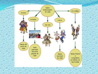 Este documento presenta información sobre Chile, incluyendo su ubicación en América del Sur, sus características geográficas como país tricontinental que se extiende por tres continentes, y detalles sobre su cultura, como sus bailes folclóricos, fiestas tradicionales y símbolos patrios.