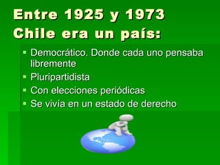 El documento analiza la situación política y social de Chile entre 1925 y 1973, destacando la democracia y la oposición que enfrentó el presidente Salvador Allende. Se describen las reformas intentadas por Allende y las dificultades que llevaron al golpe de estado de 1973, resultando en la dictadura de Augusto Pinochet y la pérdida de la democracia. Finalmente, se menciona la eventual recuperación de la democracia en 1990.