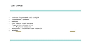 El programa Chile Crece Contigo es un subsistema de protección integral a la infancia que brinda apoyo y servicios a niños y familias desde el embarazo hasta el ingreso a la enseñanza básica, enfocándose en aquellos en mayor vulnerabilidad. Este programa, coordinado por el Ministerio de Desarrollo Social, garantiza acceso a diversos servicios para el desarrollo infantil temprano y promueve competencias parentales. A través de múltiples programas, Chile Crece Contigo busca fomentar un entorno comunitario y social adecuado que potencie el desarrollo de los niños y niñas.