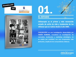 Este documento presenta resúmenes de algunos resultados clave del estudio Chilescopio 2015 sobre las actitudes y comportamientos de los chilenos. Los temas cubiertos incluyen percepciones sobre el país, bienestar personal, tiempo libre, trabajo, alimentación, compras, marcas, publicidad y medios. El estudio analiza tendencias a lo largo del tiempo y diferencias demográficas. Se invita a contactar a los directores del estudio para obtener más información o la versión completa.