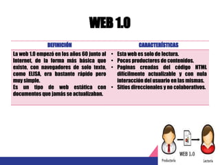 El documento resume las características de las diferentes versiones de la web desde la Web 1.0 hasta la Web 5.0. La Web 1.0 consistía en páginas web estáticas con poco contenido actualizable. La Web 2.0 permitió la interacción y colaboración entre usuarios. La Web 3.0 se centró en hacer la web más inteligente a través de la inteligencia artificial. La Web 4.0 propuso una interacción más personalizada con el usuario. Finalmente, la Web 5.0 pretende crear experiencias emocionales personalizadas para los usuarios a trav