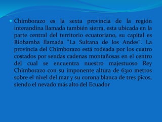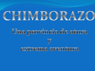 La provincia de Chimborazo se encuentra en el centro de Ecuador y limita con cuatro cadenas montañosas, incluyendo el volcán Chimborazo de 6,310 metros, el punto más alto del país. La capital y ciudad más grande es Riobamba, desde donde los turistas pueden visitar atracciones como el Parque Nacional Sangay, las alfombras de Guano, y lagunas en la provincia. Los viajes en tren también son populares, especialmente el trayecto a Alausí conocido como la "Nariz del Diablo".