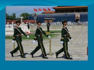 El documento presenta una breve historia de China, incluyendo sus dinastías y períodos principales desde el siglo XXI a.C. hasta 1949 d.C., cuando se estableció la República Popular de China. También describe la geografía de China, incluyendo sus provincias, regiones autónomas y algunas de sus características geográficas más destacadas como el Tíbet, Sichuán, Shanghái, Taiwán, Pekín y Hong Kong.