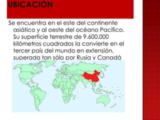 China se encuentra en el este de Asia y oeste del Pacífico, siendo el tercer país más grande del mundo. Sus principales religiones son el budismo y taoísmo. El gobierno chino se basa en una estructura socialista y su sistema educativo es muy competitivo aunque no es obligatorio, lo que dificulta que algunos estudien.