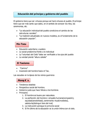 El documento describe la evolución de la educación en la antigua China. Inicialmente, la educación solo estaba disponible para la nobleza y enseñaba los Seis Clásicos. Tras el feudalismo, la educación se popularizó. La educación buscaba que cada persona cumpla su deber de acuerdo con el "orden celestial" para lograr la armonía social. Los filósofos Confucio y Mencio enseñaron que la educación debía cultivar la virtud y la compasión para mejorar al gobernante y al pueblo.
