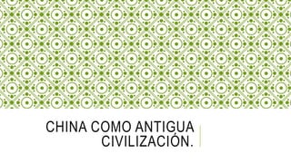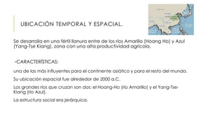 La antigua civilización china se desarrolló entre los ríos Amarillo y Azul en China, que proporcionaron una zona fértil para la agricultura. Se ubicó espacialmente alrededor del 2000 a.C. y tuvo una estructura social jerárquica. Pasó por varias dinastías e hizo importantes inventos como la cerámica y la porcelana, mientras que su economía evolucionó de la agricultura a industrias como la metalurgia y la seda.