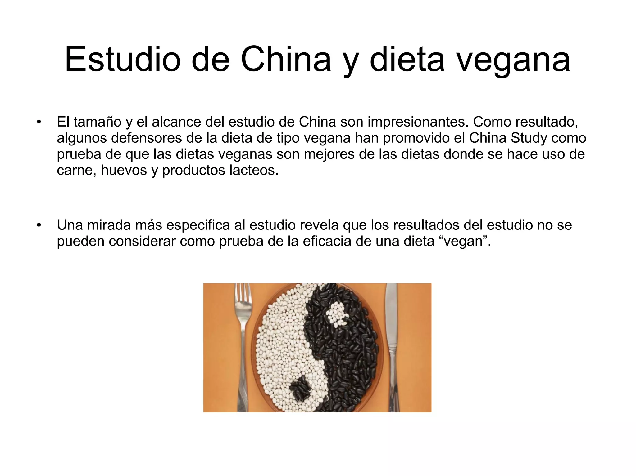 El estudio de China y la dieta analizó las dietas y tasas de mortalidad en diferentes regiones de China. Aunque las dietas con menos proteínas animales tenían mejores resultados cardiovasculares, las dietas estudiadas no eran completamente veganas y contenían un 5,7% de energía de origen animal. Además, los resultados del estudio en China no necesariamente se aplican a otras culturas debido a factores como la genética, contaminación y preparación de alimentos que también pueden afectar las enfermedades del corazón.