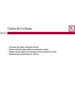 Este documento presenta un resumen de las principales fuentes de datos económicos de China, datos estructurales clave sobre la economía china y sus motores de crecimiento. Incluye información sobre el PIB, la población, la industria automotriz, la vivienda, el comercio exterior y la iniciativa Belt and Road.
