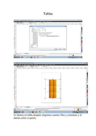 El documento describe cuatro elementos básicos de diseño gráfico: tablas, efectos tridimensionales, imágenes y textos. Proporciona instrucciones breves sobre cómo aplicar formatos y estilos a cada elemento, incluyendo la capacidad de agregar color, modificar letras y seleccionar imágenes.