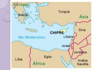 Chipre es una isla mediterránea dividida políticamente entre la República de Chipre, reconocida internacionalmente, y la República Turca del Norte de Chipre, reconocida solo por Turquía. La isla tiene un clima mediterráneo y un terreno montañoso, y la mayoría de la población es cristiana ortodoxa griega o musulmana. La economía se basa en los servicios y el turismo.