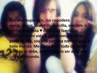 Este documento presenta un resumen de la vida de una mujer joven. Describe sus fortalezas como ser optimista y persistente, así como sus debilidades como el miedo a fallar y la desorganización. Sus metas son convertirse en una profesional forense para ayudar a su familia. Cree que con esfuerzo y la ayuda de Dios podrá lograr sus objetivos y verse a sí misma en el futuro como una persona exitosa que defiende la justicia.