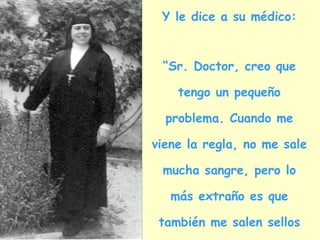 Una monja visita a su ginecólogo porque le sale sangre y sellos durante su período. El médico, sorprendido, le pide que se desvista para examinarla. Al revisarla, el médico estalla en risas al darse cuenta de que los supuestos "sellos" son en realidad etiquetas adhesivas de plátanos pegadas a su cuerpo.