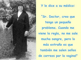 Una monja visita a su ginecólogo preocupada porque durante su periodo no sangra mucho y le salen sellos de correos por la vagina. El médico examina la zona y estalla en risas al darse cuenta de que no son sellos, sino etiquetas adhesivas de plátanos.