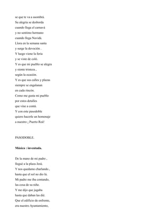 Este documento presenta la chirigota escolar "Los notas del Reggio" del curso escolar 2003/04 del nivel 2o Grupo A. La chirigota consiste en varias canciones y coplas sobre temas escolares y de la localidad de Puerto Real, Andalucía. Los objetivos son culturales, musicales, de dramatización, lenguaje, personales y sociales como conocer las tradiciones locales, desarrollar habilidades musicales y de grupo, y ampliar el vocabulario.