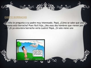 Un niño le pregunta a su padre cómo saber si una persona está borracha. El padre responde que si él estuviera borracho vería a dos hombres caminando cuando en realidad solo hay uno, lo que indica que está borracho.
