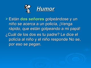 Un niño le pide a un policía que ayude porque están golpeando a su padre, pero no sabe cuál de los dos hombres es su padre debido a la pelea. Memo le dice a su mamá que está contento con su nombre porque así lo llaman en la escuela. Una joven le cuenta a su amiga que le gustan los "pequeños detalles" de su novio, refiriéndose en realidad a su pequeña mansión, jet y yate.