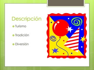 El documento describe una empresa de turismo y entretenimiento que ofrece tours. La empresa busca convertirse en el mejor proveedor de servicios de entretenimiento para el 2015 a través de un crecimiento estable y generando utilidades y empleos. Su misión es ofrecer un servicio de calidad a precios competitivos con responsabilidad y honestidad para satisfacer a los clientes. Sus fortalezas incluyen puntualidad, seguridad, servicio al cliente, tecnología e personal calificado.