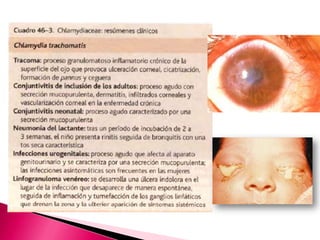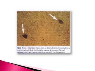 Este documento describe las características de Chlamydia trachomatis, una bacteria gramnegativa que causa tracoma y linfogranuloma venéreo. Posee una pared celular compleja con membranas interna y externa. Se replica dentro de vacuolas en las células huésped y pasa por formas infecciosas y no infecciosas. Puede infectar diversos tejidos y causar conjuntivitis, cervicitis, uretritis y otras infecciones. Se diagnostica mediante cultivo, detección de antígen