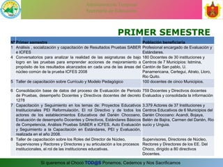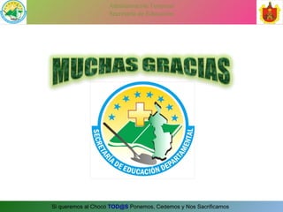 El documento resume las acciones realizadas por la Secretaría de Educación del Chocó en el primer y segundo semestre de 2009 para mejorar la calidad educativa. Estas incluyeron capacitaciones a docentes, análisis de pruebas, talleres sobre currículo y roles directivos. También se consolidó una base de datos de evaluación docente y se capacitó a maestros en alfabetización. Se logró empoderar a actores educativos y mejorar procesos, aunque persisten dificultades como falta de continuidad y recursos.