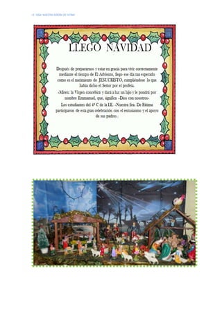 Los estudiantes y maestros de la Escuela Primaria "Nuestra Señora de Fatima" celebraron el nacimiento de Jesús a través de villancicos y una chocolatada. Los niños de 4to grado representaron a la Virgen María, San José y los tres Reyes Magos en un villancico. Después compartieron una chocolatada y recibieron regalos de los Reyes Magos. La docente Delia Angélica Villarreal supervisó las actividades para conmemorar la Navidad.