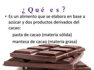 El chocolate se elabora a partir de la pasta de cacao, la manteca de cacao y azúcar. Existen diferentes tipos de chocolate dependiendo de la proporción e ingredientes agregados como la leche. El chocolate es un alimento nutritivo compuesto principalmente por carbohidratos, grasas y proteínas, y aporta energía, sodio, potasio, calcio, fósforo, hierro y vitaminas.