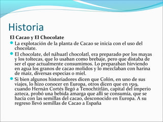 El cacao y el chocolate se originaron en Mesoamérica, donde los mayas y toltecas lo usaban como brebaje amargo mezclado con maíz, especias o miel. Aunque algunos dicen que Colón lo llevó a Europa, fue Hernán Cortés quien lo presentó en España después de probar una bebida de cacao amarga en Tenochtitlán. Actualmente, los granos de cacao se tostan, muelen y mezclan con leche y azúcar para hacer chocolate, bombones y otras golosinas, luego de extraerlos de los frutos