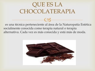 La Chocolaterapia es una técnica naturopática que utiliza el cacao y el chocolate aplicados tópicamente sobre la piel para mejorar la salud y apariencia de la piel mediante sus propiedades antioxidantes, hidratantes y circulatorias. La Chocolaterapia se aplica mediante masajes o baños de chocolate y tiene beneficios como el alivio del estrés y la depresión, así como la nutrición, hidratación y tonificación de la piel.