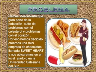 El documento resume los costos unitarios de producción de una empresa de chocolates incluyendo materia prima y costos indirectos. Luego detalla los ingresos y egresos de la empresa Sweet Heart S.A, incluyendo venta de productos, costos de producción, marketing, experimentación, mano de obra, administración, ventas y utilidad neta.