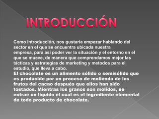 El documento describe el proceso de producción del chocolate, desde la molienda de los granos de cacao hasta su empaquetado final. Explica que los granos de cacao se tuestan y muelen para extraer un líquido que es el ingrediente base del chocolate. Luego, el chocolate pasa por procesos de refinación, enfriamiento y moldeado antes de ser envasado y empaquetado para su distribución y venta. También brinda información histórica sobre el origen y consumo del chocolate a través de las culturas maya, azteca y europea.