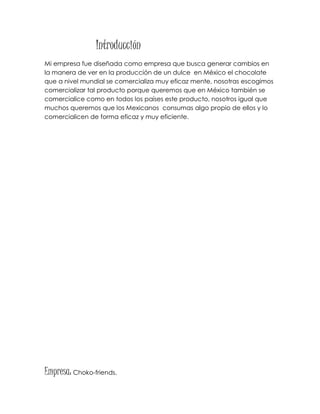 El documento presenta información sobre la empresa Choko Friends S.A. de C.V., una productora mexicana de chocolates. La empresa busca comercializar el chocolate de forma eficaz en México para que sea consumido como en otros países. Choko Friends produce y vende chocolates de alta calidad con ingredientes naturales, con la misión de satisfacer al consumidor con un producto innovador. La empresa se enfoca en el liderazgo, trabajo en equipo, calidad y respeto.