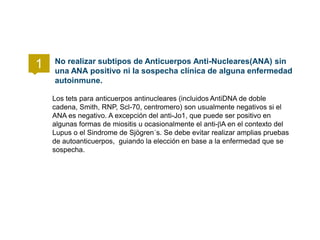 Este documento proporciona cinco recomendaciones sobre pruebas y tratamientos para enfermedades musculoesqueléticas: 1) No realizar subtipos de anticuerpos antinucleares sin una prueba ANA positiva. 2) No realizar pruebas para enfermedad de Lyme sin hallazgos clínicos apropiados. 3) No usar resonancia magnética de rutina para monitorear artritis inflamatoria. 4) No prescribir agentes biológicos para artritis reumatoide sin antes probar tratamiento convencional. 5
