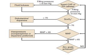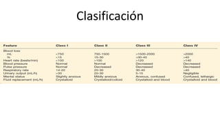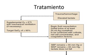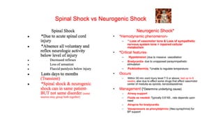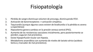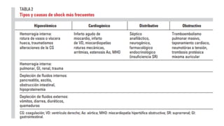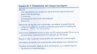 El documento describe los diferentes tipos de choque, incluyendo hipovolémico, séptico, anafiláctico y neurogénico. Explica las etapas del choque desde compensado hasta irreversible y las manifestaciones asociadas como taquicardia, hipotensión y fallo multiorgánico. También describe específicamente el choque neurogénico que ocurre después de una lesión en la médula espinal en el nivel T6 o superior, causando parálisis, retención de orina y bradicardia e hipotensión.