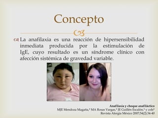 La anafilaxia es una reacción alérgica grave que puede afectar múltiples órganos y sistemas. Se caracteriza por la aparición aguda de síntomas que incluyen urticaria, angioedema, dificultad respiratoria y disminución de la presión arterial. El tratamiento de emergencia incluye la administración de epinefrina, oxígeno suplementario y fluidos intravenosos, así como monitorear las vías aéreas, la presión arterial y los signos vitales.