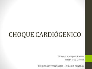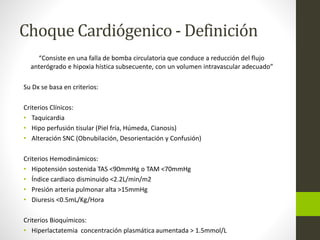1) El choque cardiógenico es una falla de la bomba cardíaca que reduce el flujo sanguíneo y causa hipoxia tisular, con una tasa de mortalidad del 50-80%. 2) Sus causas más comunes son el infarto agudo de miocardio y las arritmias, y se caracteriza clínicamente por taquicardia, hipoperfusión y alteración del estado mental. 3) Su manejo inicial incluye oxigenación, volumen intravascular, vasop