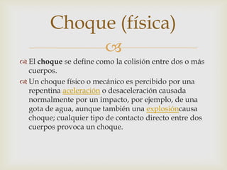 Un choque se define como la colisión entre dos o más cuerpos que interactúan fuertemente durante un breve período de tiempo. Un choque se mide por la aceleración máxima, duración y forma del pulso, y puede reducirse absorbiendo la energía del impacto con materiales deformables. Las colisiones conservan la cantidad total de movimiento antes y después del contacto.