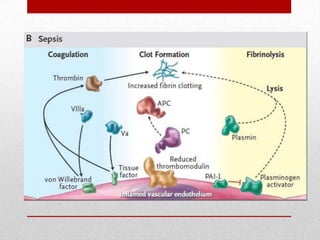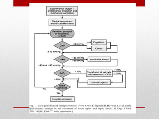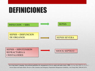 Este documento proporciona definiciones y guías sobre el diagnóstico y manejo de la sepsis y el shock séptico. Define la sepsis, la sepsis severa y el shock séptico, y describe los signos y síntomas de la respuesta inflamatoria sistémica y la disfunción de órganos. Además, resume las recomendaciones de la Campaña de Supervivencia a la Sepsis sobre el manejo temprano de la hemodinámica, la antibioticoterapia, el soporte y otras medidas para el tratamiento de la sepsis y el shock séptico.