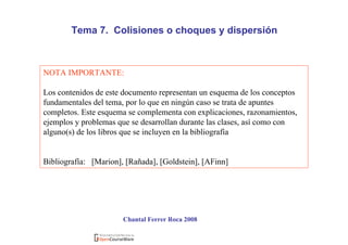 Este documento trata sobre colisiones o choques y dispersión. Introduce los conceptos de conservación del momento lineal y de la energía en choques elásticos e inelásticos. Explica los sistemas de coordenadas laboratorio y centro de masas, y cómo se aplican los principios de conservación para determinar los estados finales a partir de los iniciales. También cubre la dispersión elástica por una esfera dura y la dispersión de Rutherford.